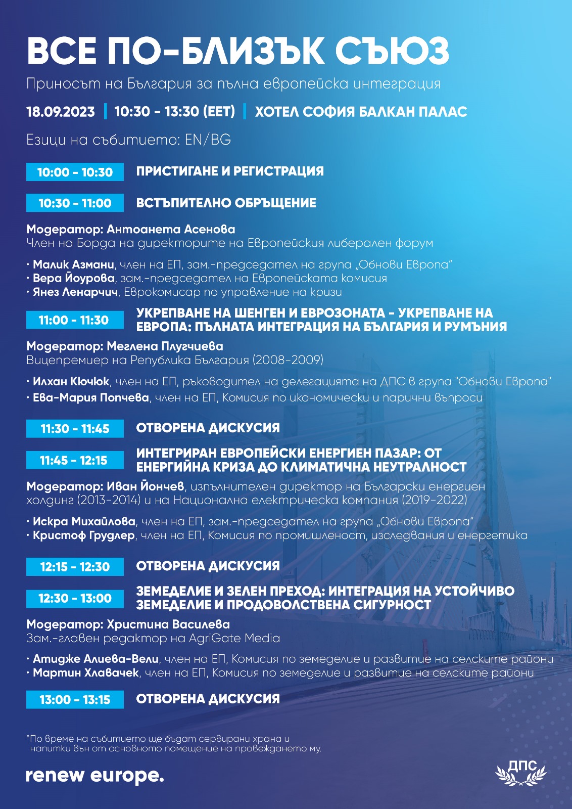 На 18 септември (понеделник) от 10:30 часа в София Хотел Балкан ще се проведе конференцията “Все по-близък Съюз - приносът на България за пълна европейска интеграция”.