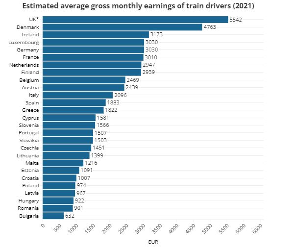 През по-миналата година прогнозните средни брутни месечни доходи на машинистите са варирали от 632 евро в България до 5542 евро в Обединеното Кралство. Сред държавите членки на ЕС Дания, в която машинистите взимат средно по 4 463 евро, е единствената страна, в която железничарите печелят толкова много. По над 3000 евро взимат Ирландия, Люксембург, Германия и Франция. Страните са следвани плътно от Нидерландия и Финландия, където взимат съответно 2 947 и 2 939 евро.