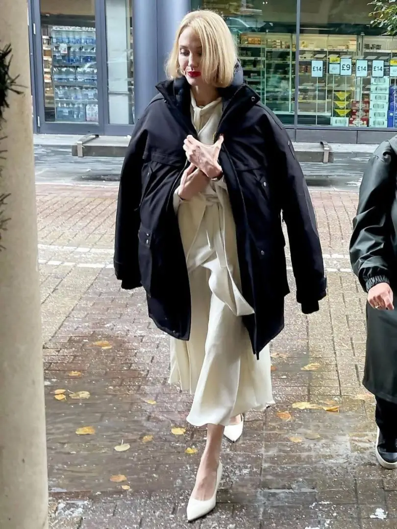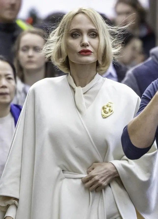 Джоли беше заснета на снимачната площадка в Лондон в четвъртък, облечена в стилен кремав костюм. Използва ярко червено червило и червен лак за нокти, които подчертават впечатляващата ѝ визия.