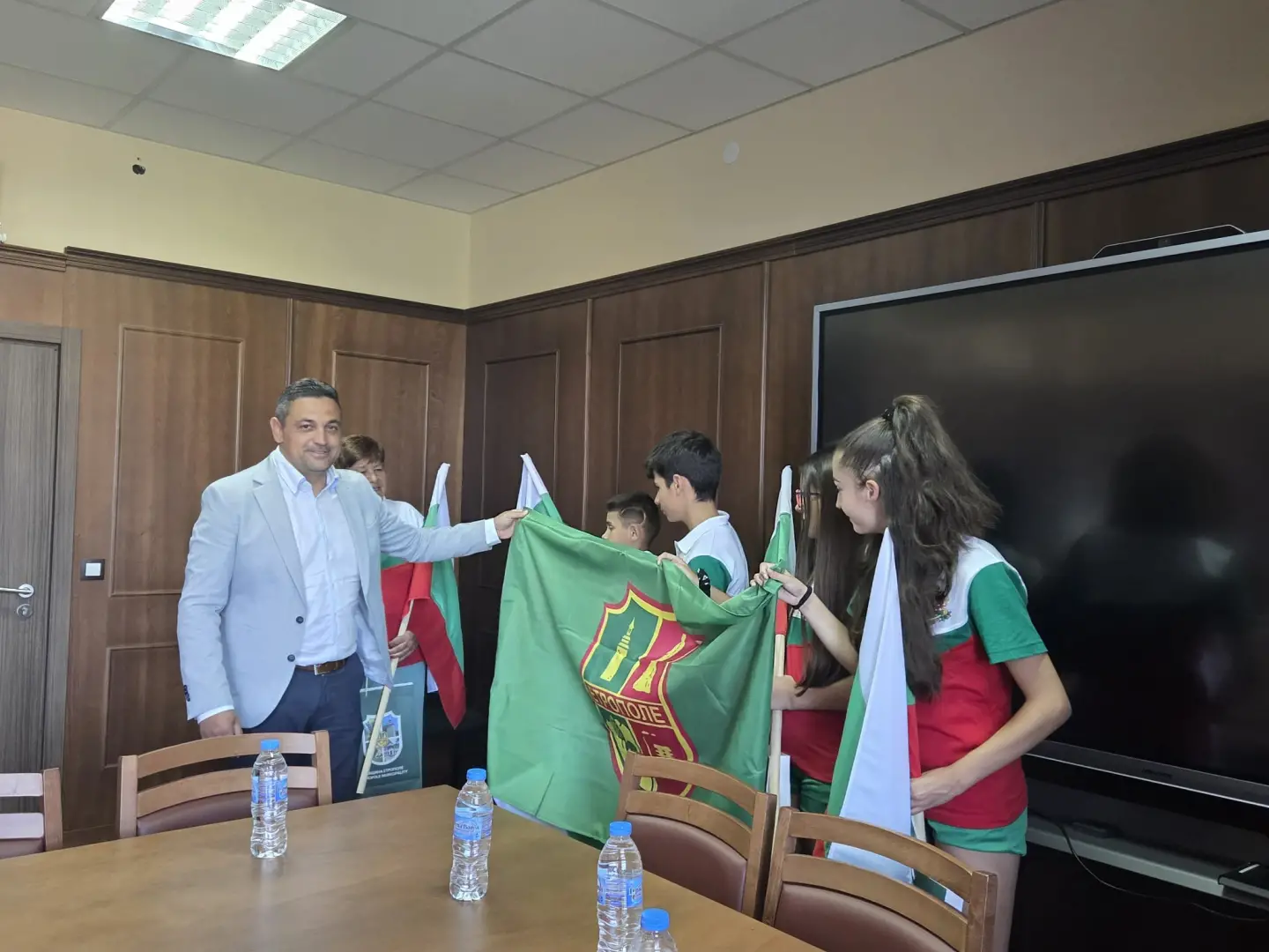 Кметът инж. Владимир Александров тържествено изпрати младежите, класирали се за Европейското състезание по приложно колоездене и им подари българското знаме и книга със забележителностите на Етрополе и околностите.