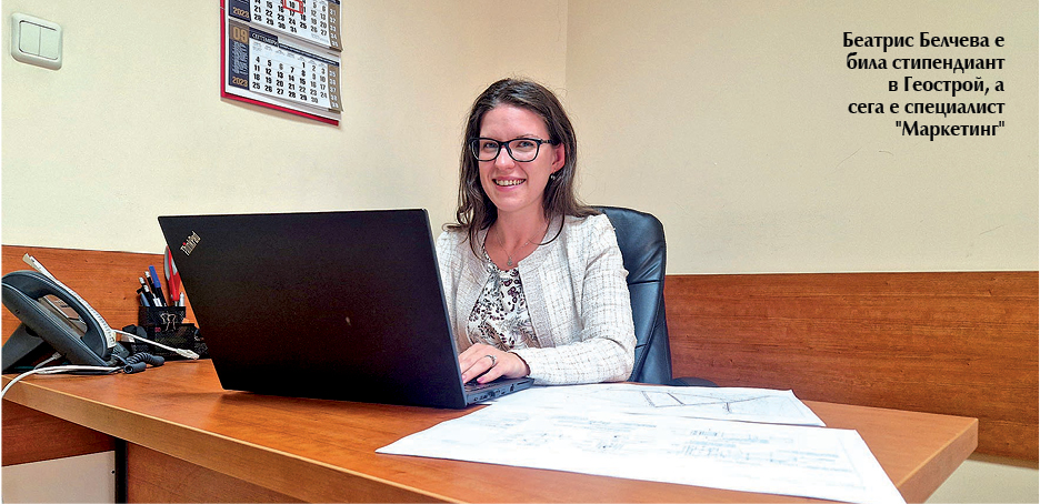 Освен в Елаците-Мед, все повече млади жени започват работа и в строителното дружество Геострой. "Започнах стаж в Геострой през лятото на 2021 г. Кандидатствах почти на шега. Обадиха ми се за интервю, одобриха ме и започнах. Няколко месеца след стажа ми предложиха да бъда част от стипендиантската програма на дружеството. Това беше чест за мен", разказва Беатрис Белчева, която почти две години трупа професионален опит в Геострой. След успешното представяне и на втория стаж в компанията, Беатрис получава предложение за работа. В момента е специалист "Маркетинг" в дирекция "Маркетинг и офериране в строителството" и студент в УАСГ. Тя учи магистратура "Управление на проекти в строителството". "Благодарение на работата в Геострой се убедих, че искам да уча тази специалност и в магистърската програма. Представях си Геострой като огромно предизвикателство. Две години по-късно осъзнавам, че със започването ми тук не само се хвърлих в дълбокото, но и се научих да плувам. За времето, през което работя в компанията, станах по-отговорна и дисциплинирана. Екипът на дружеството дава кураж постоянно да показваш най-доброто от себе си", с въодушевление разказва Беатрис.