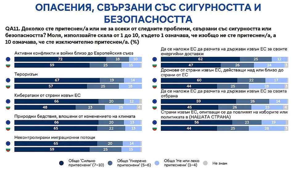 Докато европейците поставят на първо място отбраната и геополитическата стабилност, българите гледат много по-близо до себе си. Инфлацията, растящите цени и разходите за живот са тема №1 за близо 60% от хората у нас, далеч над средното за ЕС. Следват бедността, социалното изключване и липсата на достатъчно работни места.