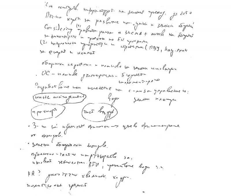 В материалите на разслдването, които прокуратурата изпрати в парламента, се вижда, че Калушев е водил подробни писмени бележки по въпроси, засягащи усвояването на пари по Плана за възстановяване и устойчивост на Европейския съюз в областта на зелените политики.