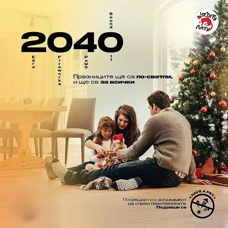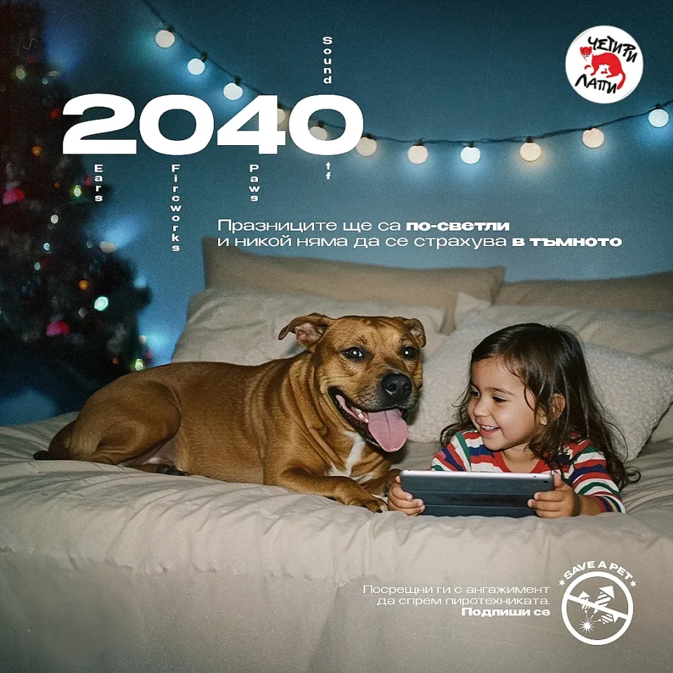 Прогноза на изкуствен интелект сочи, че чак през 2040 г. шумът от фойерверките ще заглъхне. Още две десетилетия ще са нужни, за да осъзнаем цената, която плащаме за миговете зрелище. Подкрепяйки кампанията на ЧЕТИРИ ЛАПИ обаче истинската светлина на празниците може да бъде видяна много по-рано – още днес чрез общ избор и съпричастност.
