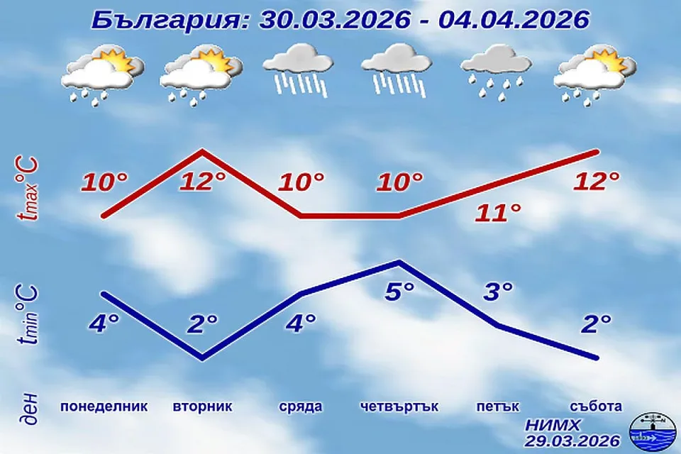 В сряда, четвъртък и петък времето ще се определя от средиземноморски циклон. Ще бъде облачно с повсеместни и значителни валежи от дъжд, а в планините - от сняг. Вятърът ще бъде от изток-североизток, умерен и силен, като в петък ще отслабне и ще се ориентира от север-северозапад. Температурите ще останат по-ниски от обичайните за периода, а преобладаващите максимални стойности ще бъдат между 8° и 13°.