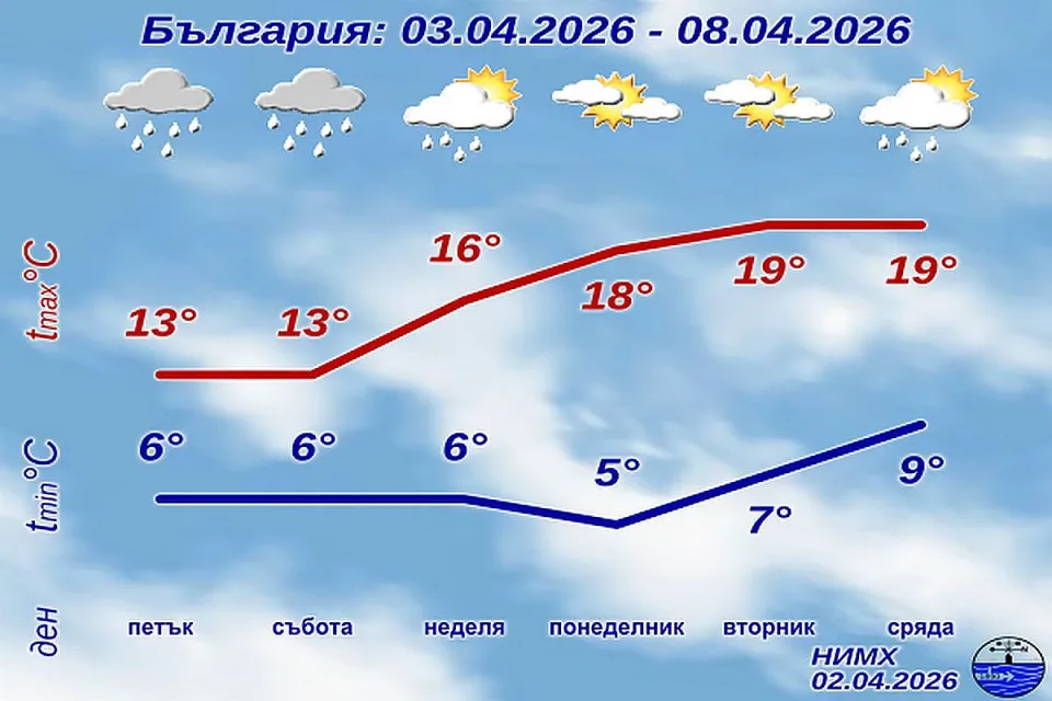 В петък и събота ще се задържи предимно облачно време, на места със краткотрайни валежи, главно в следобедните часове. Вятърът в петък временно ще отслабне и ще се ориентира от юг, а по-късно от северозапад, като в Източна България ще бъде от североизток. Температурите ще започнат да се повишават и максималните ще достигнат между 11° и 16°.