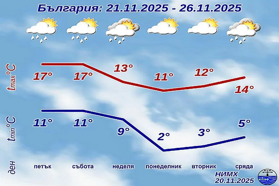 През следващите дни времето ще остане доста динамично. Температурите ще са в широки граници, минималните ще са от 6°-7° в северозападните райони до 15°-16° в югоизточните, а максималните от 10°-12° на места в Западна България до 20°-22° в Източна. В петък и събота ще има по-значителни временни разкъсвания и намаления на облачността. Валежите ще са по-малко като количество и на по-малко места, главно в западните райони и в Рило-Родопската област. В Източна България вятърът ще остане умерен, временно силен, с южна компонента; в котловините в Западна България ще е слаб, временно ще стихва; там ще бъде мъгливо или с ниска облачност.