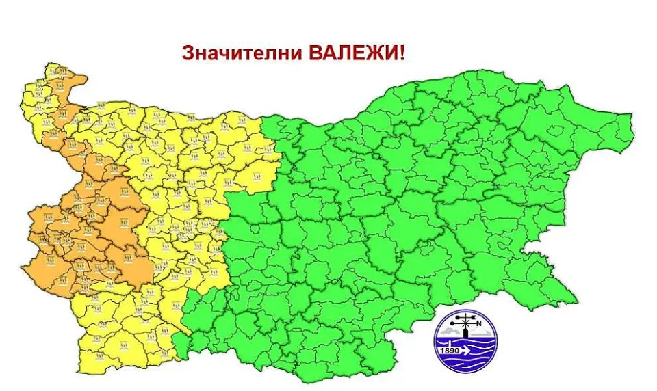 Жълт код е в сила за Враца, Плевен, Ловеч, Монтана и Видин, Благоевград, Пазарджик и София-област.