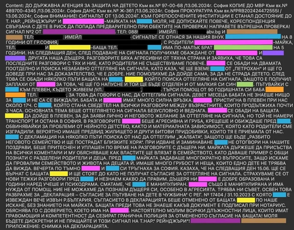 Още тогава възрастното семейство иска обяснение от дъщеря си – Албена, защо Леон е с непознати лица, всичките от мъжки пол. Бабата и дядото пътуват до София, за да изразят недоверието си към „Рейнджърите“. „Изразих опасения, че той е в нерегламентирана зависимост от хора, които нямат право да упражняват контрол върху детето, след което казах на майката, че ще направя проучването, притеснен от мъжкия пол на състава и огромната промяна в поведението на Леон", заявява в сигнала си до ДАЗД дядото. След този разговор всичко се променя. Възрастните хора с месеци не знаят нищо за 8-годишното си внуче.