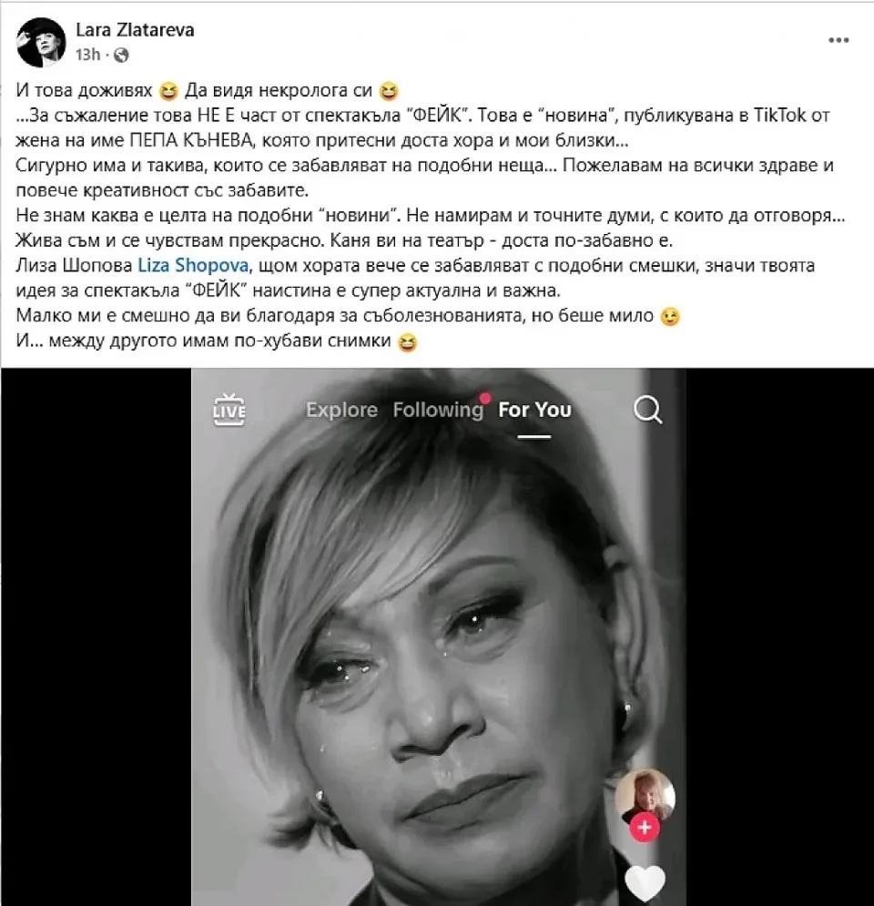 Поредна фалшива новина обиколи социалните мрежи. Този път в нея се твърдеше, че е починала актрисата Лара Златарева. Информацията се оказа напълно невярна, но за кратко предизвика силен отзвук и стотици коментари онлайн.