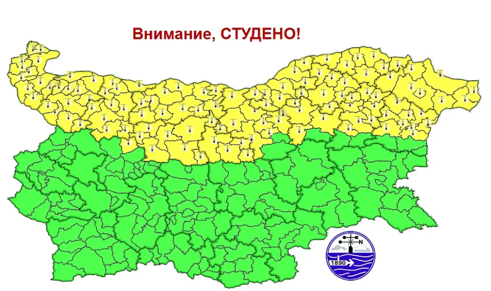 Очакват се много ниски температури, като в тези области минималните ще са от минус 14 до минус 9 градуса, а максималните температури също ще са отрицателни. Жълтият код предупреждава за възможни здравни проблеми при чувствителни и болни хора, възрастни, деца и хора без дом, които са на открито.