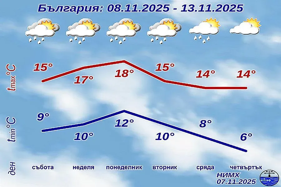 Максималните температури ще бъдат между 11° и 16°, в София - около 12°.