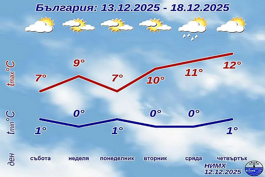 Сутринта започва с характерна за сезона картина от мъгли и ниска слоеста облачност над Дунавската равнина, Лудогорието и Горнотракийската низина, докато в голяма част от страната времето остава почти тихо и слънчево. След обяд запад-северозападният вятър ще се усили до умерен и постепенно ще разкъса мъглата, като видимостта значително ще се подобри. Максималните температури ще достигнат от 8° до 13°, а в крайните югозападни райони ще бъде малко по-топло. В София се очакват около 9°.