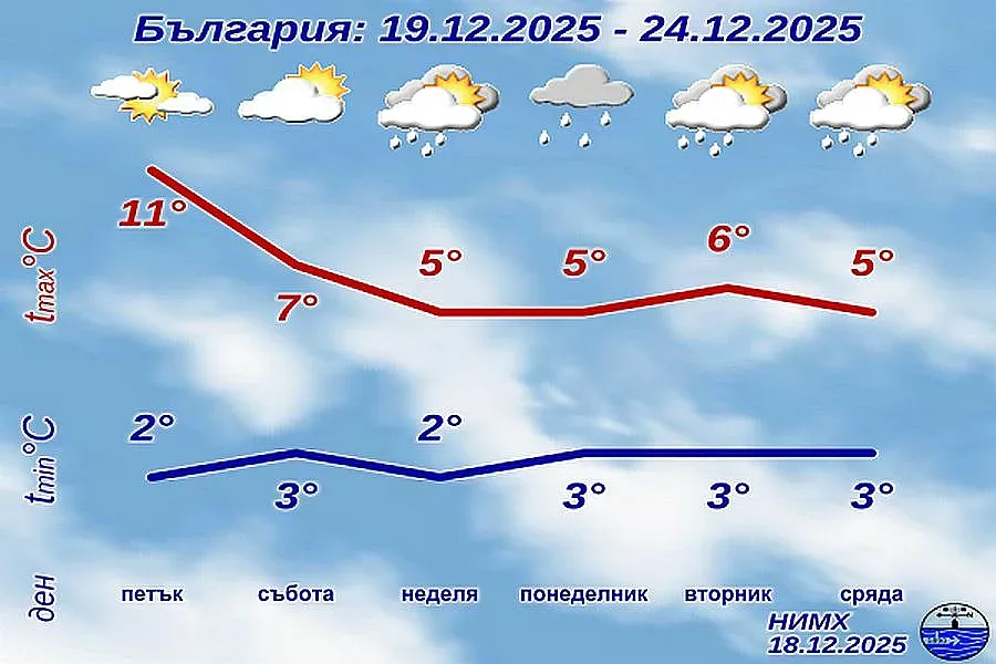 В петък вятърът ще отслабне, а в много райони напълно ще стихне. Само на отделни места в котловините и низините ще има мъгла или ниска облачност. Времето ще е предимно слънчево с разкъсана висока облачност, а дневните температури ще са между 9° и 14°. Минималните ще бъдат между минус 1° и 4°. В събота отново на много места ще има мъгла.
