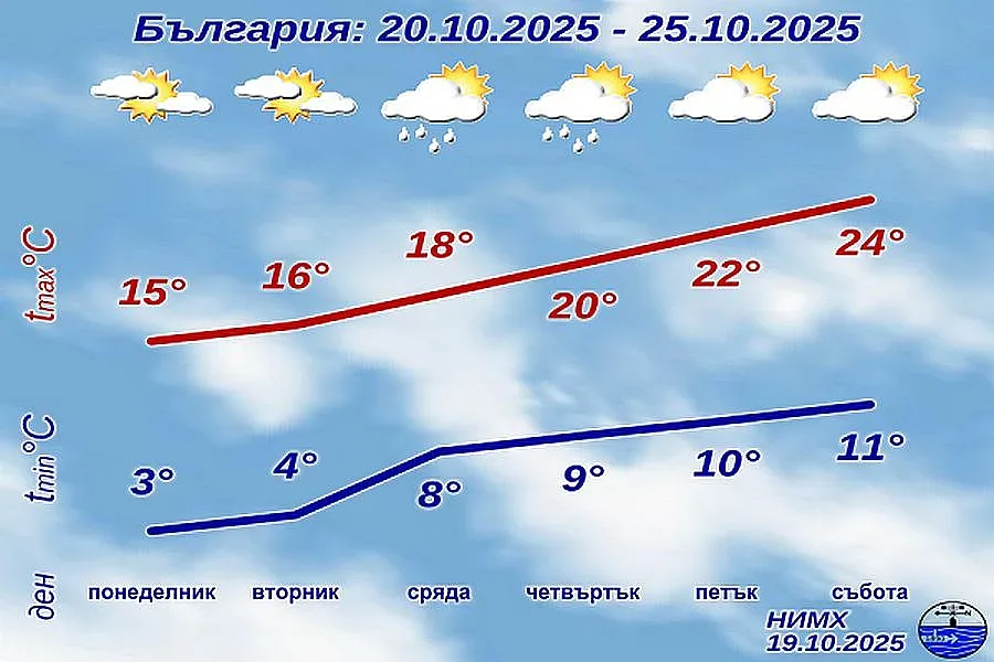 В началото на новата седмица времето ще бъде слънчево, във вторник с разкъсана висока облачност. Вятърът ще се ориентира от юг-югоизток, ще бъде слаб. Сутрин ще е студено с минимални температури в по-голямата част от страната между 2° и 7°, по-ниски на места в котловините, където ще има слана. Максималните температури ще бъдат между 14° и 19°. В сряда и четвъртък ще има по-значителни увеличения на облачността, на отделни места в Западна България и планините ще превали слаб дъжд. Вятърът ще остане от юг, температурите ще се повишат още и максималните в много райони ще са около и над 20°. В петък и събота ще бъде предимно слънчево със слаб юг-югозападен вятър. Сутрин на места в низините и котловините ще бъде мъгливо или с ниска слоеста облачност. Топло време с минимални температури между 7° и 12°, максимални в събота между 22° и 27°.