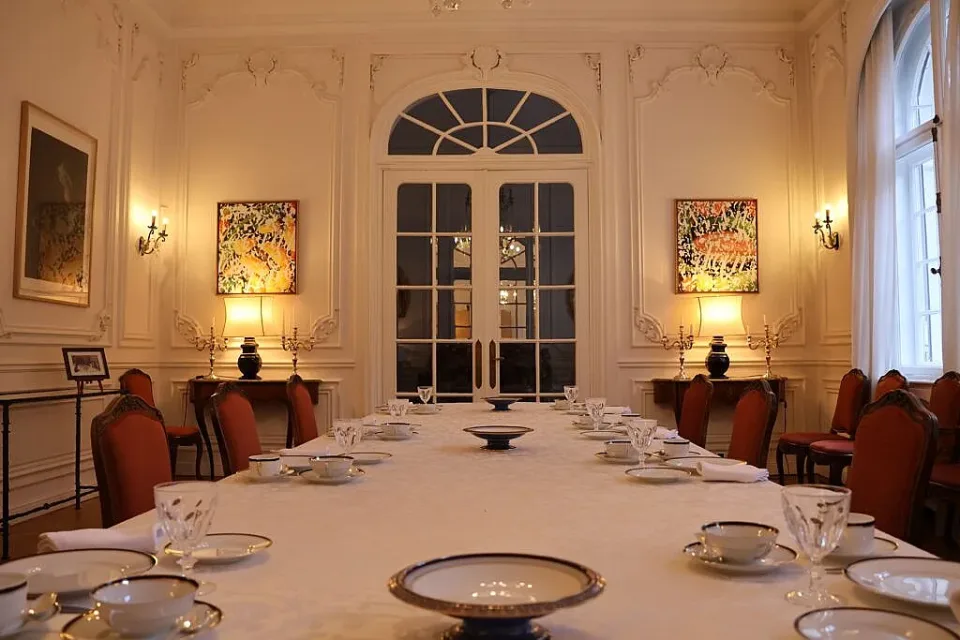 Престижен и представителен дом на френската дипломация в България, резиденцията съдържа богата колекция от порцелан, произведен от прочутата Севърска манифактура, както и произведения на изкуството, предоставени от френското държавно учреждение „Mobilier National de France“, включително творби на известни съвременни художници като Готфрид Хонегер и Клод Виала. Тази изискана вътрешна украса блести сред запазените в оригиналния им вид дървени ламперии и мраморни камини, които красят стените на великолепната градска къща.