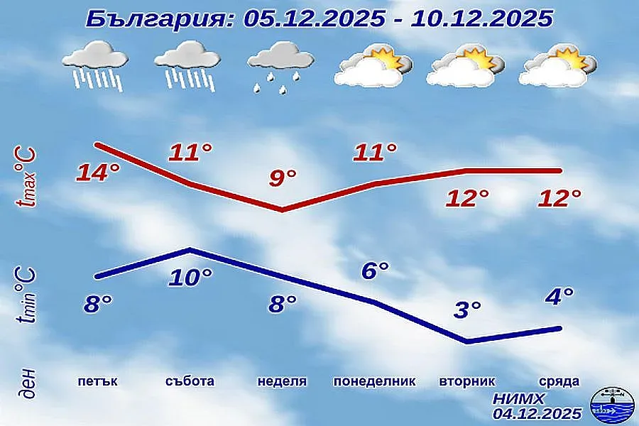 През следващите дни времето ще остане облачно с валежи, като значителни по количество ще са на места в Южна България. В петък вятърът ще се ориентира от изток и ще се усили. Минималните температури ще бъдат между 5° и 10°, а максималните - между 10° и 15°, по-високи в Югоизточна България. В събота вятърът ще е от североизток, минималните температури ще са по-високи, а дневните - по-ниски с 2-3 градуса.