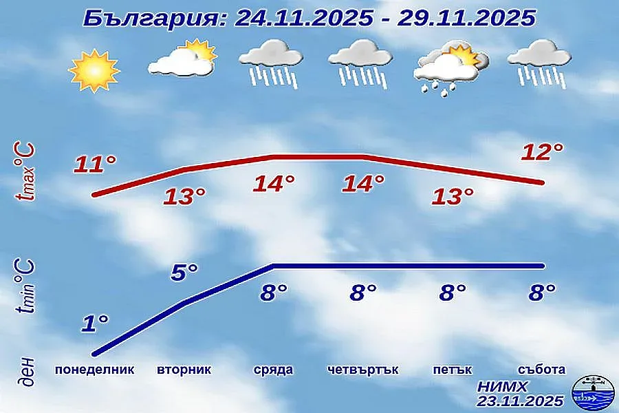 В сряда и четвъртък, под влияние на средиземноморски циклон, ще бъде облачно с валежи от дъжд. Има повишена вероятност в отделни райони валежите да са временно интензивни и значителни по количество. Вятърът ще остане слаб, в източните райони - умерен от юг. Температурите ще са с малък дневен ход, от 5°-6° в северозападните до 16°-18° в югоизточните райони.