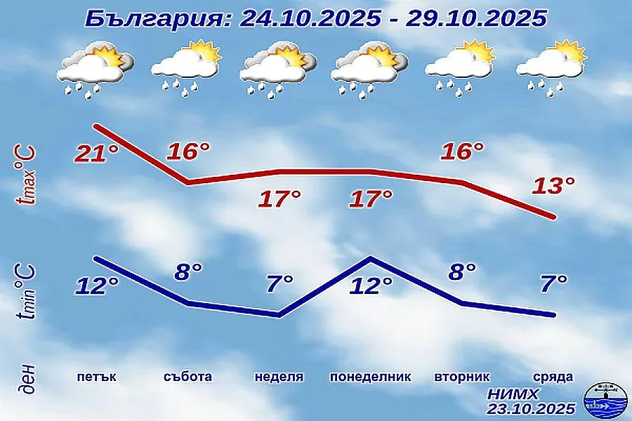 В петък облачността ще е по-често значителна и на места от запад на изток ще превали дъжд. Ще бъде ветровито, вятърът ще е умерен и силен; постепенно ще смени посоката си и от югозападен ще стане запад-северозападен. Минималните температури ще са високи, в повечето места между 9° и 14°, максималните - от 16°-17° в северозападните райони до 24°-25° в югоизточните. В събота ще има променлива облачност и след обяд на места в Северозападна България отново ще превали дъжд. Вятърът ще отслабне. Ще остане топло за периода, въпреки че температурите ще се понижат с 4°-5°. В неделя ще преобладава облачно време, на места, главно в Западна и Северна България, с валежи от дъжд. Вятърът отново ще придобие южна компонента, в източната половина от страната и ще се усили.