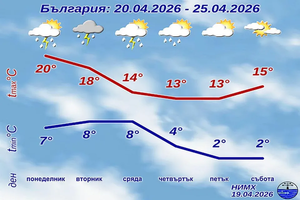 Днешният ден започва спокойно със слънчево време в по-голямата част от страната, но следобед картината ще се промени. Облачността постепенно ще се увеличава, като на места ще се стигне до краткотрайни валежи. Вятърът ще бъде осезаем, а температурите ще останат в пролетни граници. Очаква се по-нестабилно време през следващите дни.
