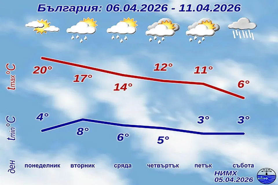 Днешният ден ще донесе типично пролетно време с преобладаващо слънце и приятни температури в цялата страна. Максималните стойности ще достигнат между 16° и 21°, а в София около 17°. Следобед ще има временни увеличения на облачността, но валежите ще бъдат краткотрайни и ограничени. Вятърът ще бъде слаб, временно умерен в Дунавската равнина, което допълнително ще създаде усещане за комфорт.