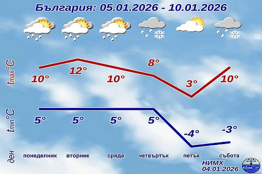 В четвъртък вятърът ще се ориентира от северозапад, по-късно през деня ще се усили и с него ще започне нахлуване на студен въздух. Ще има валежи, като през нощта срещу петък на места в Северна България и по високите полета на Югозападна България дъждът ще премине в сняг. До сутринта в петък валежите ще спрат, а през деня облачността ще се разкъса и ще намалее. Вятърът ще отслабне и ще се ориентира от запад-югозапад, а температурите ще бъдат чувствително по-ниски. В събота още от сутринта от запад на изток облачността ще се увеличава, следобед на места в Западна България ще превали, а в Дунавската равнина с обръщане на вятъра от северозапад дъждът бързо ще преминава в сняг.