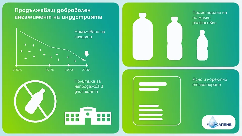 Индустрията за безалкохолни напитки и бутилирани води е първият сектор от българската хранително-вкусовата промишленост, ангажирал се доброволно и дори преизпълнил конкретната цел в призива на ЕС за доброволно намаляване на добавените захари с 10% до 2020[2]. В нейното изпълнение секторът отчете намаляване с 15,21 % на внесената в хранителния режим захар от газираните напитки. Независимо експертно проучване за калоричността на реализираните на българския пазар безалкохолни напитки[3] за периода 2015 – 2020 г. показа нарастване на дела на газираните напитки без захар (с 2,65 %), както и 6,7 % средно намаление на захарта на 100 ml в напитките от категорията, в чийто състав има добавена захар.