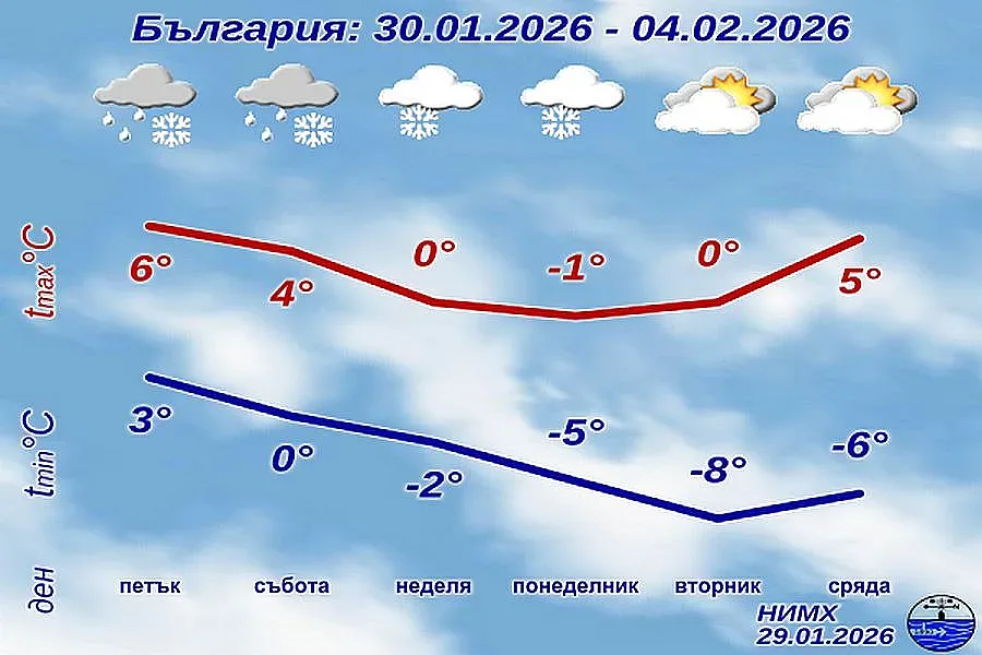 След кратко отслабване на валежите в събота, нова вълна ще се активизира от югозапад. В Южна България и по Черноморието ще вали дъжд, а в Северна България и по високите полета сняг. В неделя и понеделник дъждът ще премине в сняг и в части от Горнотракийската низина и крайбрежието. От североизток ще нахлува студен въздух със умерен до силен вятър. В понеделник минималните температури ще паднат до минус 7°-минус 2°, а дневните ще останат между минус 2° и 3°.
