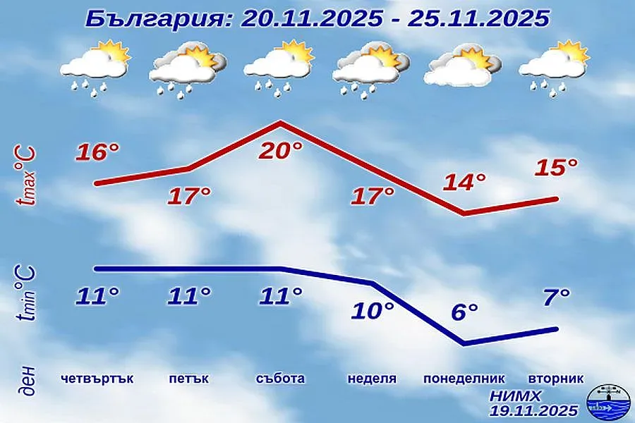 През следващите дни до края на седмицата времето ще остане доста динамично. Температурите в страната ще са в широки граници, минималните ще са от 6°-7° в северозападните райони до 15°-16° в югоизточните, а максималните от 10°-12° на места в Западна България до 20°-21° в Източна. До неделя ще има по-значителни временни разкъсвания и намаления на облачността. Валежите ще са по-малко като количество и на по-малко места, главно в западните райони и в Рило-Родопската област. В Източна България вятърът ще остане умерен, през почивните дни и временно силен, с южна компонента; в котловините в Западна България временно ще стихва и там ще бъде мъгливо или с ниска слоеста облачност.