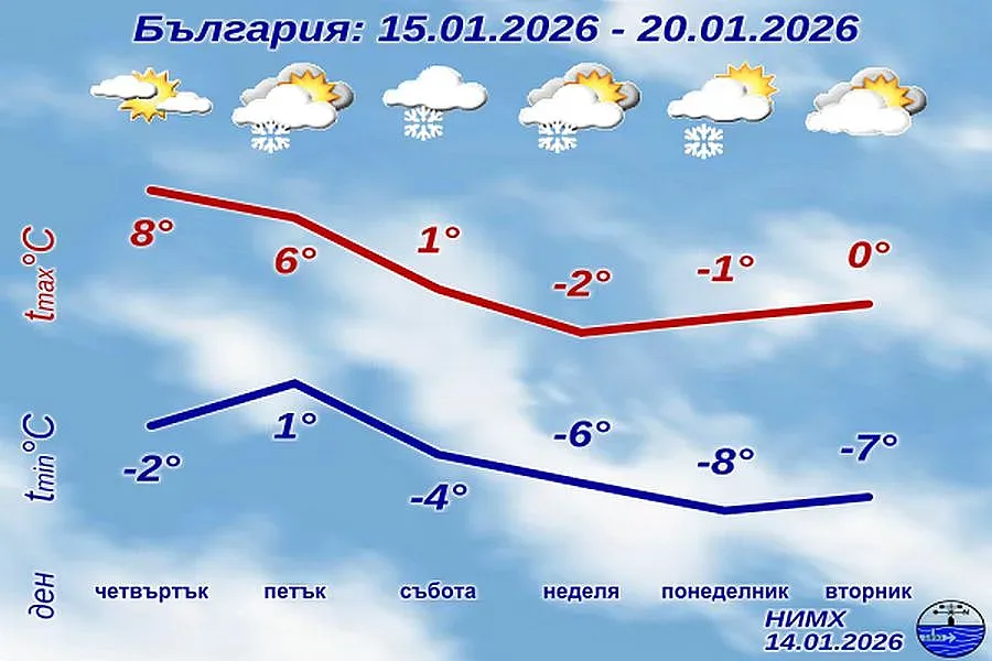 През нощта срещу петък вятърът ще се ориентира от изток-североизток и с него ще започне да нахлува нова порция студен въздух. Заоблачаването ще продължи и до вечерта в петък ще обхване по-голямата част от страната. В североизточните райони и покрай Дунав температурите ще бъдат най-ниски – между минус 2° и 0°, със слаби превалявания от сняг, докато в Южна България ще остане по-топло, с максимални стойности до 6°-8°.