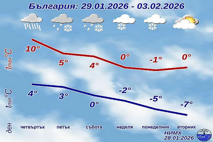 Днешният ден започва спокойно и с усещане за меко време, но това ще се окаже само кратка пауза. Още от нощта започва промяна, която в следващите дни ще донесе дъждове, циклон и рязко застудяване. В края на седмицата зимата ще се върне с пълна сила, включително със сняг и отрицателни температури.