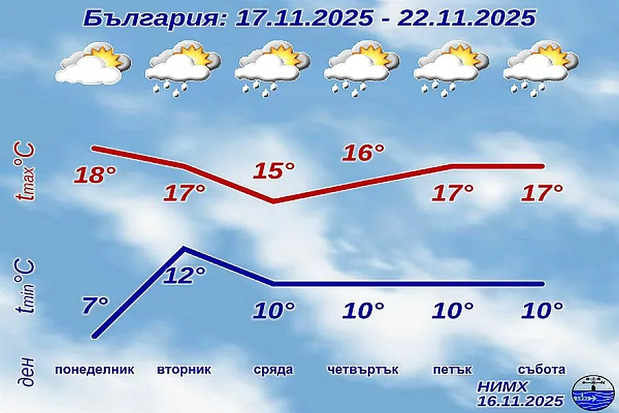 В четвъртък и петък валежи ще има на малко места, а в събота - в Западна България отново ще са на повече места. Остава топло за периода; минималните температури ще са от 4°-6° в северозападните райони до 15°-16° в югоизточните, а максималните ще са от около 14° в западните райони до 20°-21° в източните.