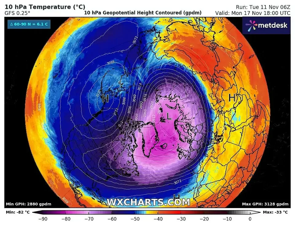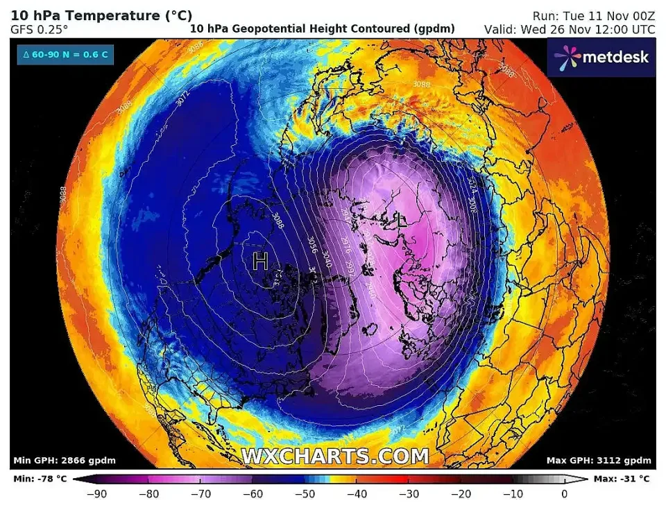 Допълнително, стратосферният полярен вихър (SPV) се очаква да бъде по-слаб от обичайното в началото на зимата. Това увеличава вероятността от ранно стратосферно затопляне (SSW) в края на ноември или началото на декември – явление, което често предшества периоди на студ и продължителни блокировки в Европа.