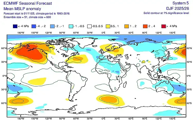 Началото на зимата се очаква да бъде по-динамично и потенциално студено. Моделите показват повишено налягане над Гренландия – знак за блокиращ режим, известен още като отрицателна фаза на Северноатлантическата осцилация (NAO–). Този модел често води до отклоняване на атлантическите циклони на юг и навлизане на по-студени арктични маси над Европа.