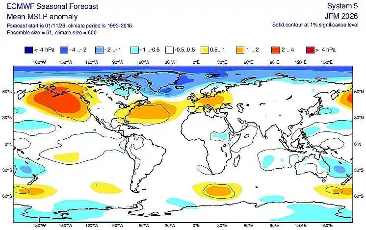 Преминавайки към втория период (JFM 2026), картата показва леко изместване: положителните аномалии остават силни над Северна Европа и Русия (+2 до +4 hPa), но се разширяват към Централна Европа. Това подсказва продължаващ антициклонически режим, който може да донесе продължителни студени периоди в Германия, Австрия и Балканите – идеални за зимни спортове, но с риск от замръзване на реките и дефицит на вода през лятото.