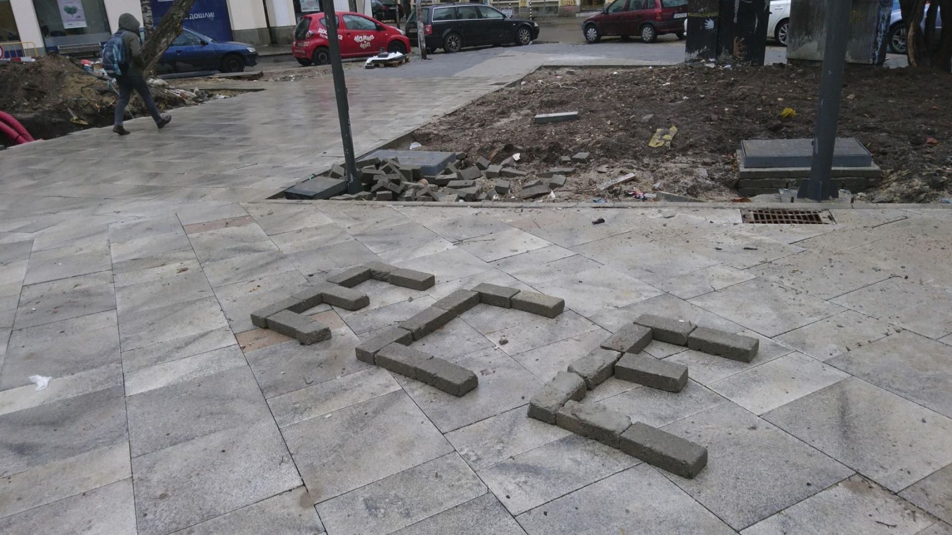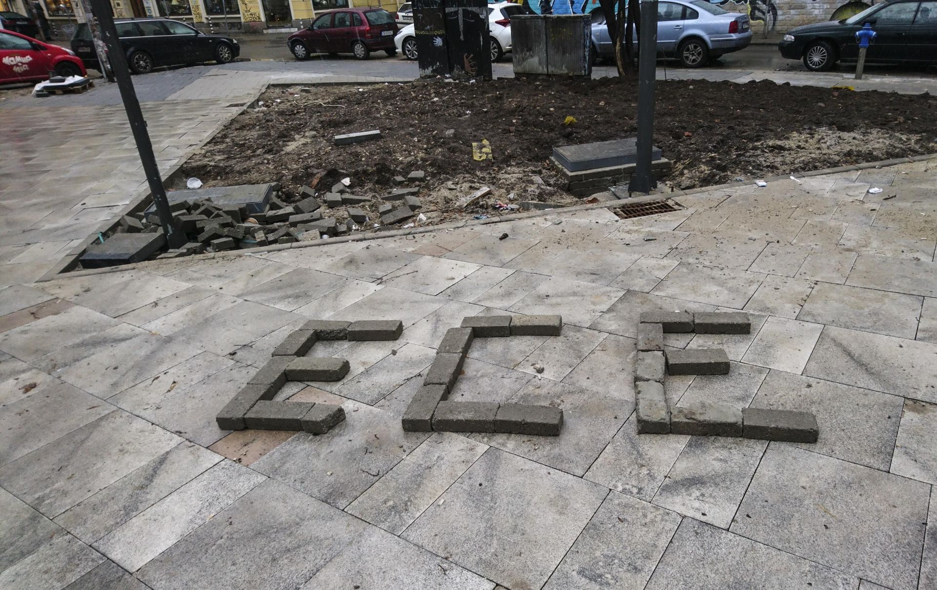 Шегаджии изписаха думата "есе" с бетонни плочки в градинката на църквата "Св.Седмочисленици". Реакцията е предизвикана от материала, която една от националните телевизии - bTV, разказа снощи в социалните мрежи: "Напиши есе, спечели къща" за 1,7 млн. канадски долара".