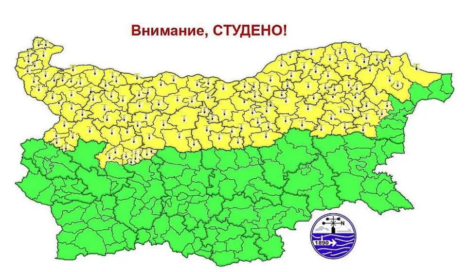 Синоптиците предупреждават за потенциално опасно време и много ниски температури - жълт код е в сила за цяла Северна България и областите: Видин, Монтана, Враца, част от София област, Плевен, Ловеч, Велико Търново, Габрово, Русе, Търговище, Разград, Шумен, Силистра, Добрич и Варна. В планините ще бъде предимно слънчево. Ще духа слаб и умерен вятър от изток-югоизток. Максималната температура на височина 1200 метра ще бъде около минус 2°, на 2000 метра – около минус 6°.
