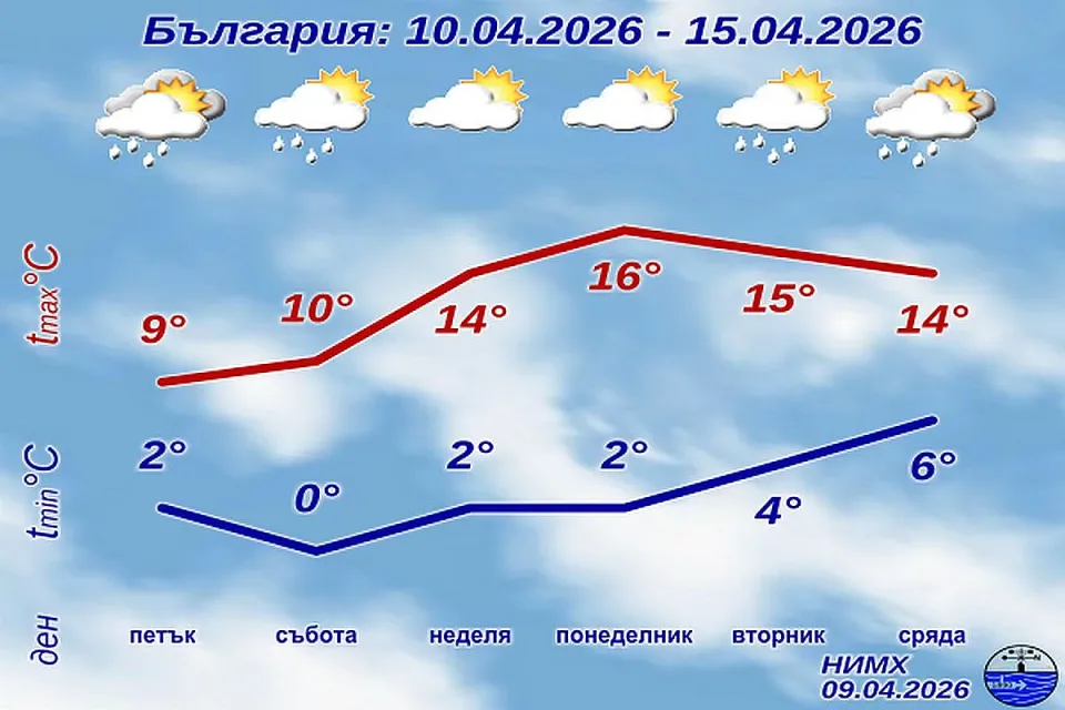 Облачността над страната днес ще бъде променлива, по-често значителна, като на места ще има валежи от дъжд. В сутрешните часове в отделни северни и планински райони дъждът ще се примесва и временно ще преминава в сняг. Почти без валежи ще остане в крайните югозападни райони. Ще духа умерен, а в Дунавската равнина, Горнотракийската низина и по долините на Струма и Места временно силен северозападен вятър, като максималните температури ще бъдат между 10° и 15°, в София - около 11°.