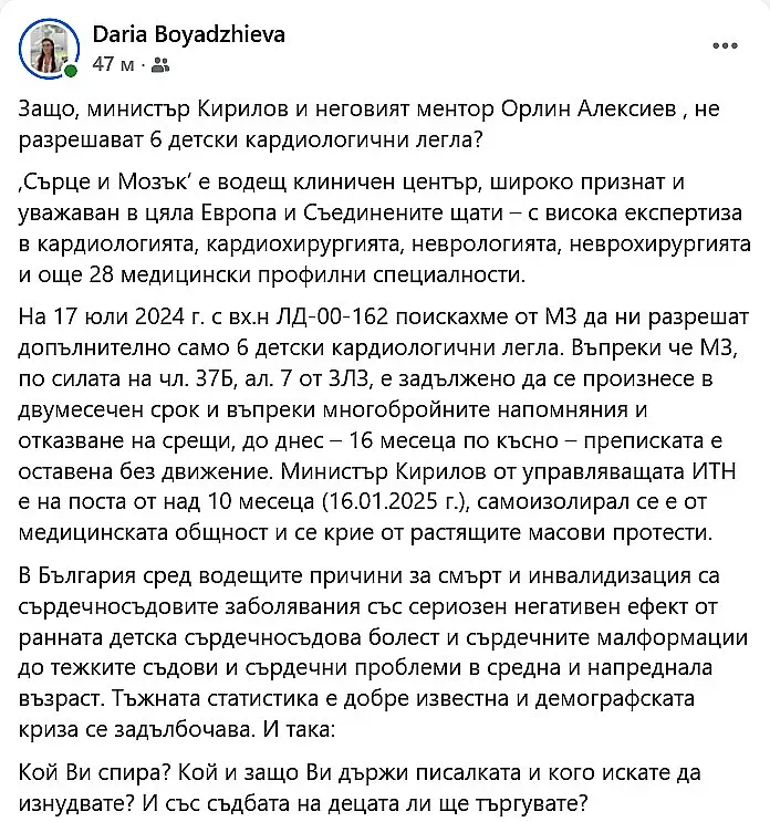 На 17 юли 2024 г. с вх.н ЛД-00-162 поискахме от МЗ да ни разрешат допълнително само 6 детски кардиологични легла. Въпреки че МЗ, по силата на чл. 37Б, ал. 7 от ЗЛЗ, е задължено да се произнесе в двумесечен срок и въпреки многобройните напомняния и отказване на срещи, до днес – 16 месеца по късно – преписката е оставена без движение. Министър Кирилов от управляващата ИТН е на поста от над 10 месеца (16.01.2025 г.), самоизолирал се е от медицинската общност и се крие от растящите масови протести.