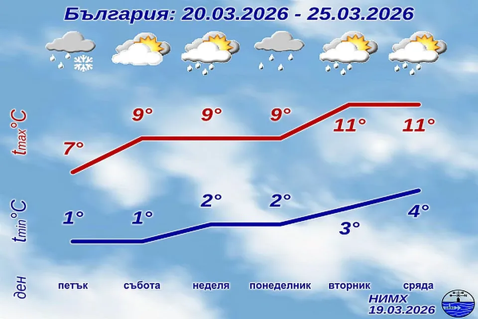 Минималните стойности вече ще бъдат над нулата в цялата страна, а максималните ще варират от 7°-8° в източните райони до 14°-16° в западната част на страната.
