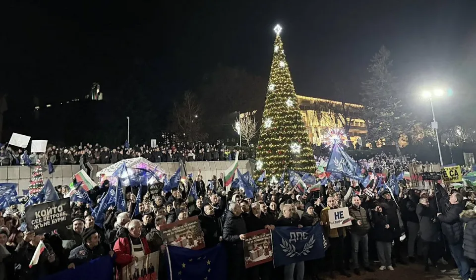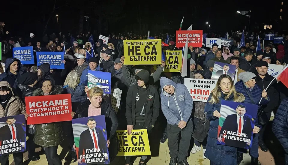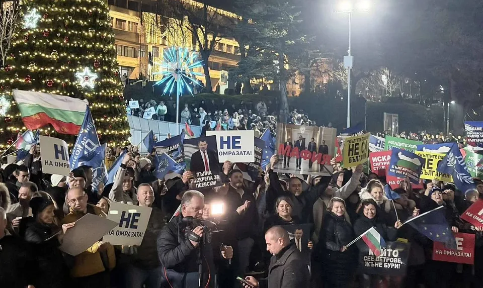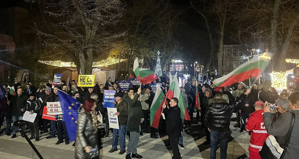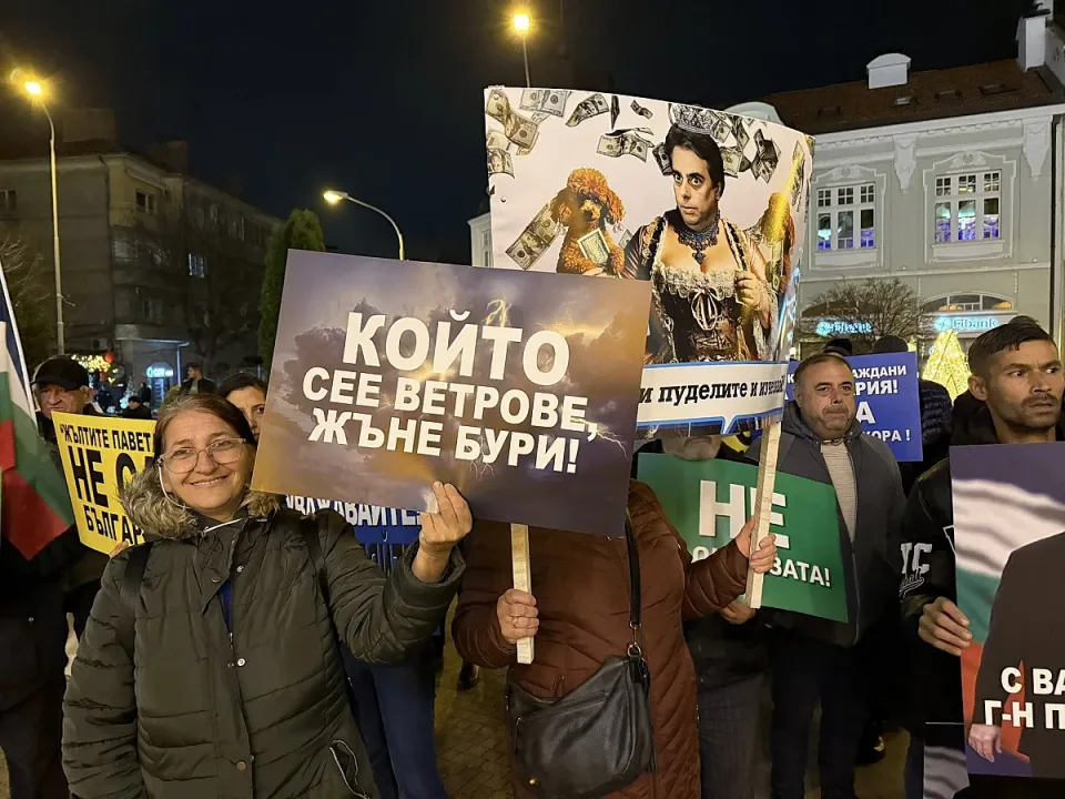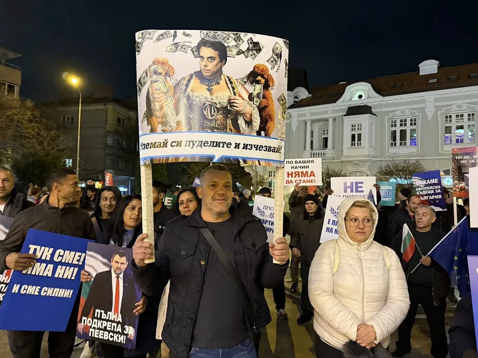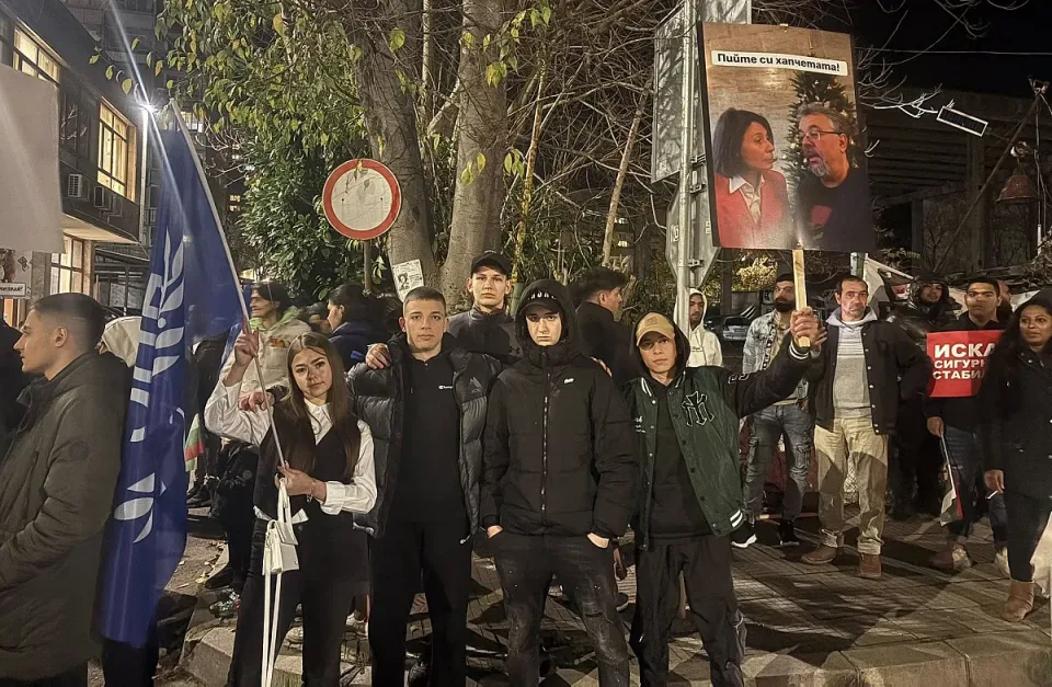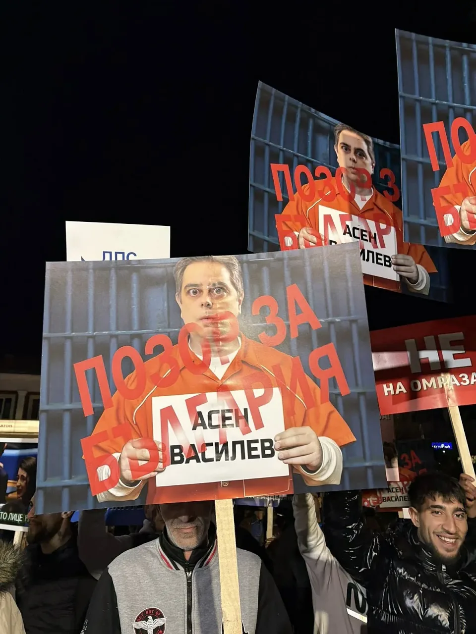 Протестиращите издигнаха плакати с надписи "Мафия", "Асен Василев - вие сте криза", "Искаме европейско бъдеще за България" и "Радев кажи си за "Боташ". На място има засилено полицейско присъствие.