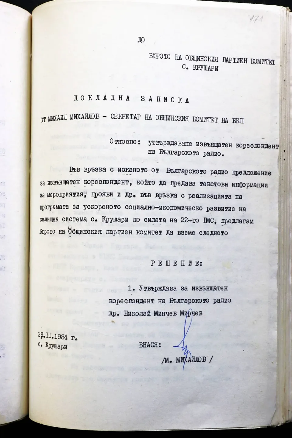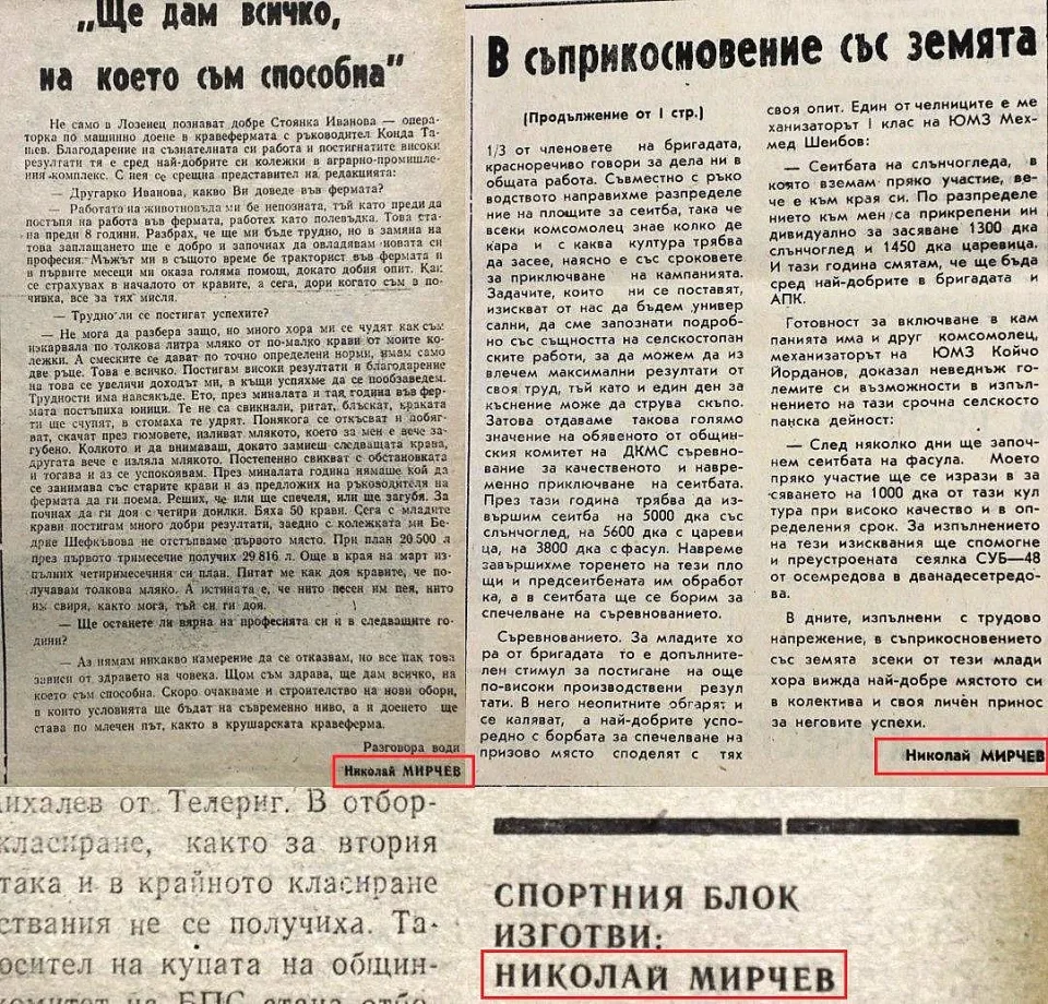 Едновременно с това Николай Мирчев е утвърден и за извънщатен кореспондент на Българското радио, както разбираме от докладна записка, подписана от секретаря на Общинския комитет на БКП-Крушари Михаил Михайлов.