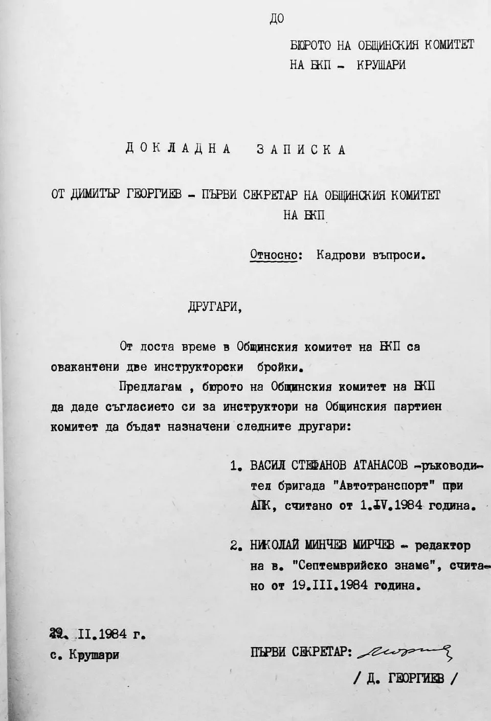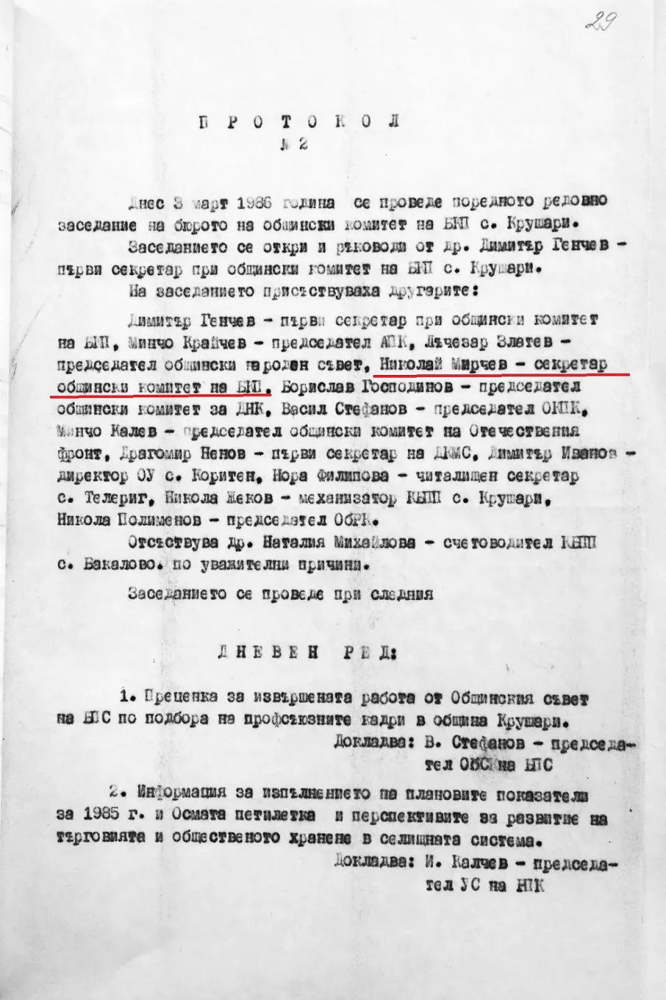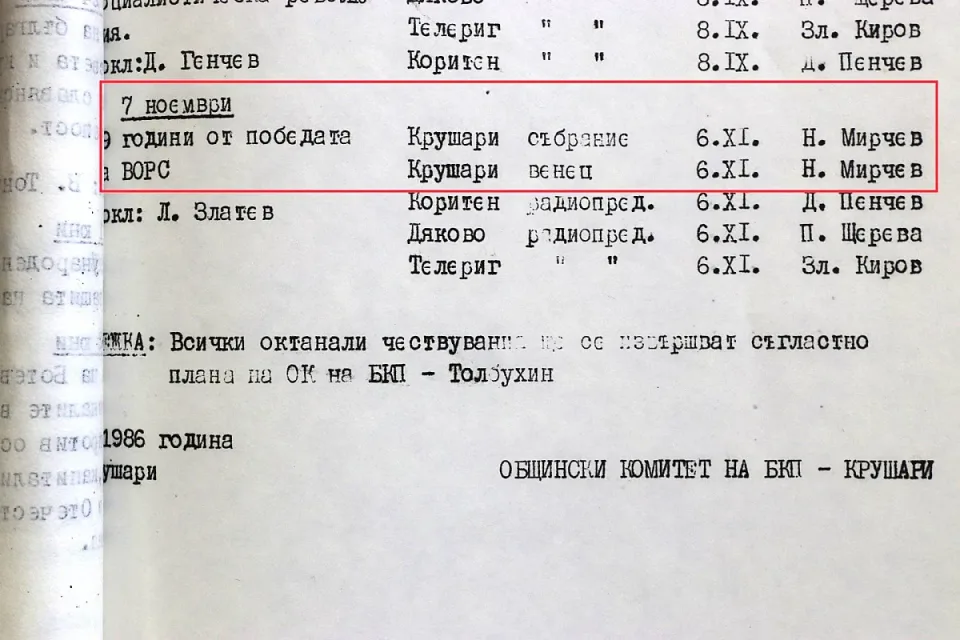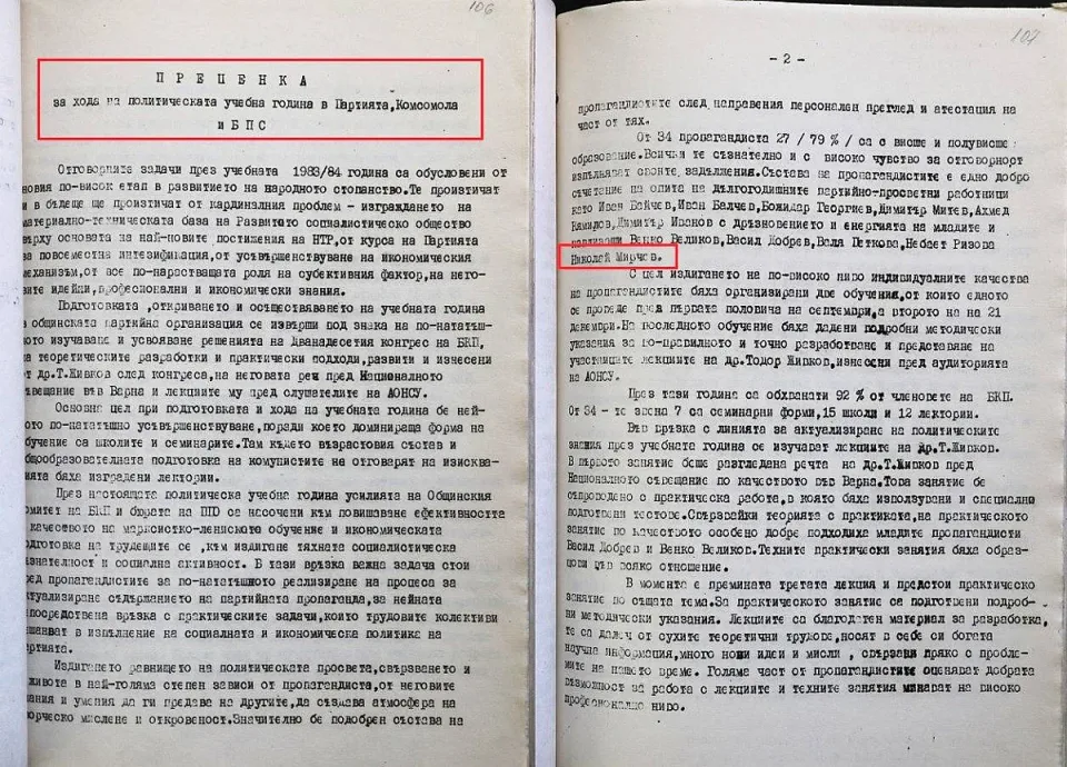 Ето какво пише в съставения и подписан от Николай Мирчев "Анализ на ПУГ (политическа учебна година, бел. моя.) в партията, комсомола и профсъюзите през 1986-1987 г.", когато той вече е секретар на Общинския съвет на БКП-Крушари:
