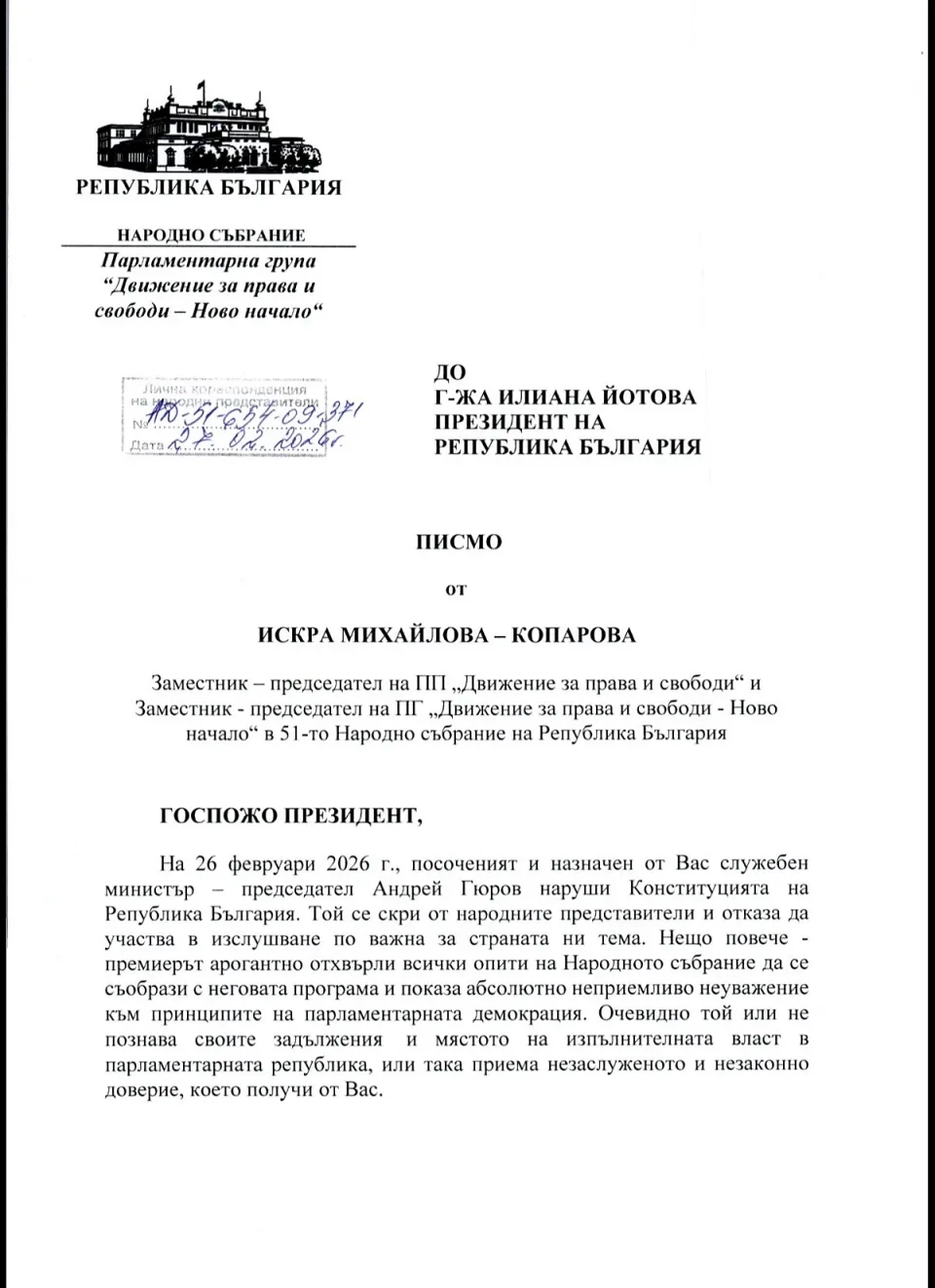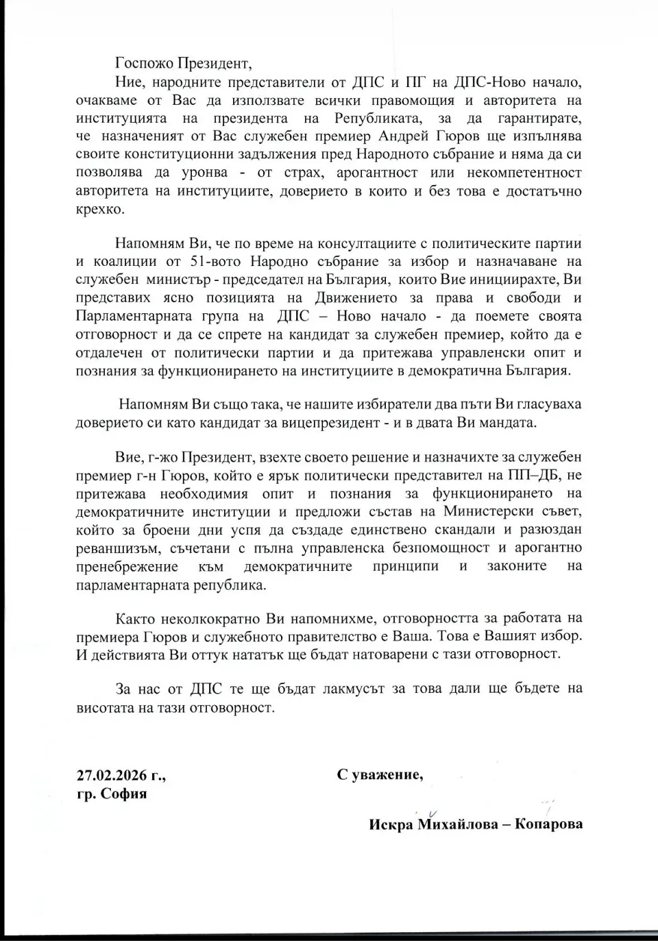 „Премиер-министърът отказа да се включи в събранието, да участва в изслушване, наруши Конституцията, арогантно пренебрегна всички наши усилия да проведем разговор с него.“ С тези думи заместник-председателят на ДПС и зам.-председател на парламентарната група на ДПС-Ново начало Искра Михайлова атакува служебния министър-председател Андрей Гюров пред медиите в Народното събрание.