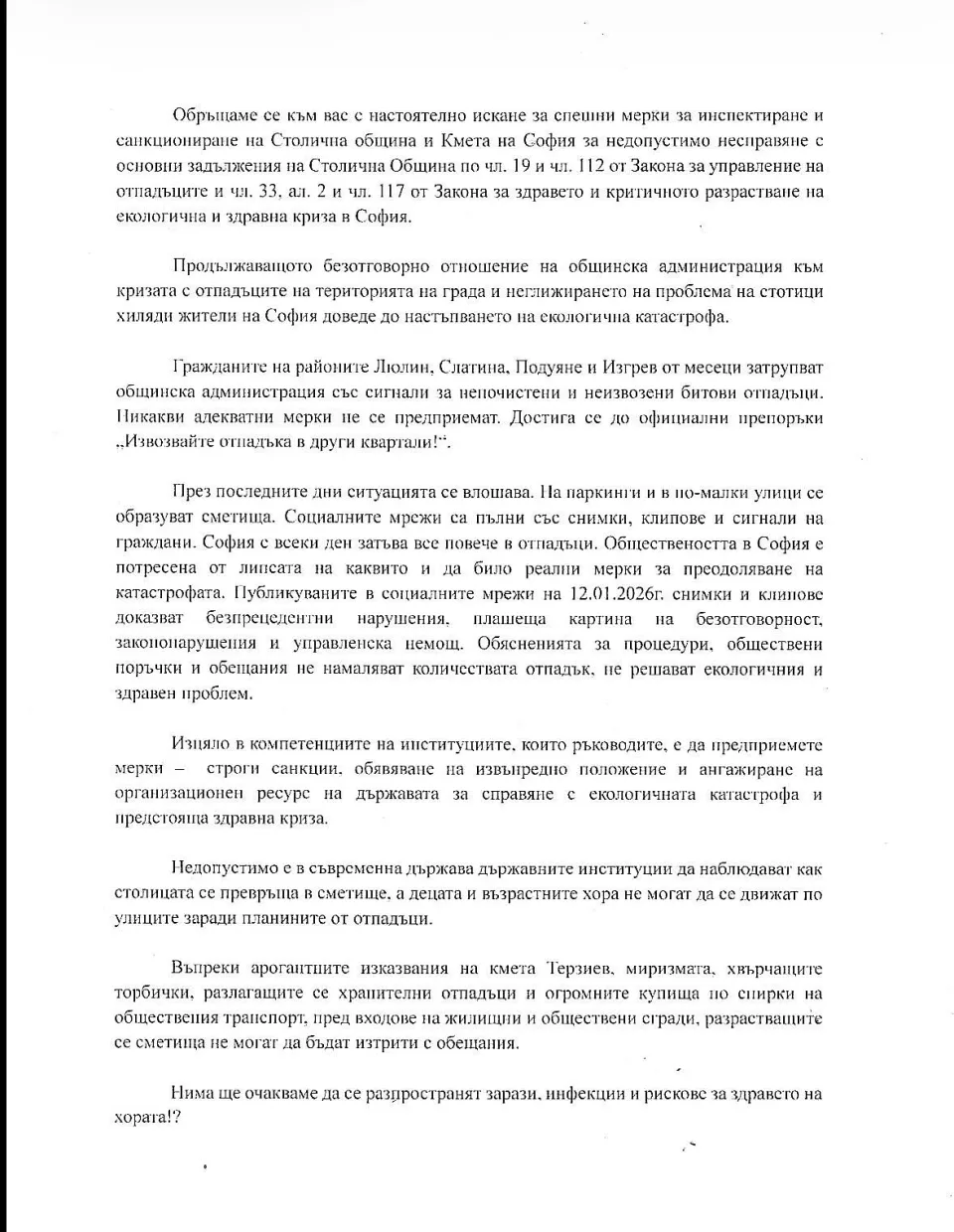 Настояваме, изискваме и ще продължаваме ежедневно да изискваме от името на всички граждани на София да приложите цялата строгост на закона и да защитите здравето, живота и жизнената среда на жителите на столицата на България.