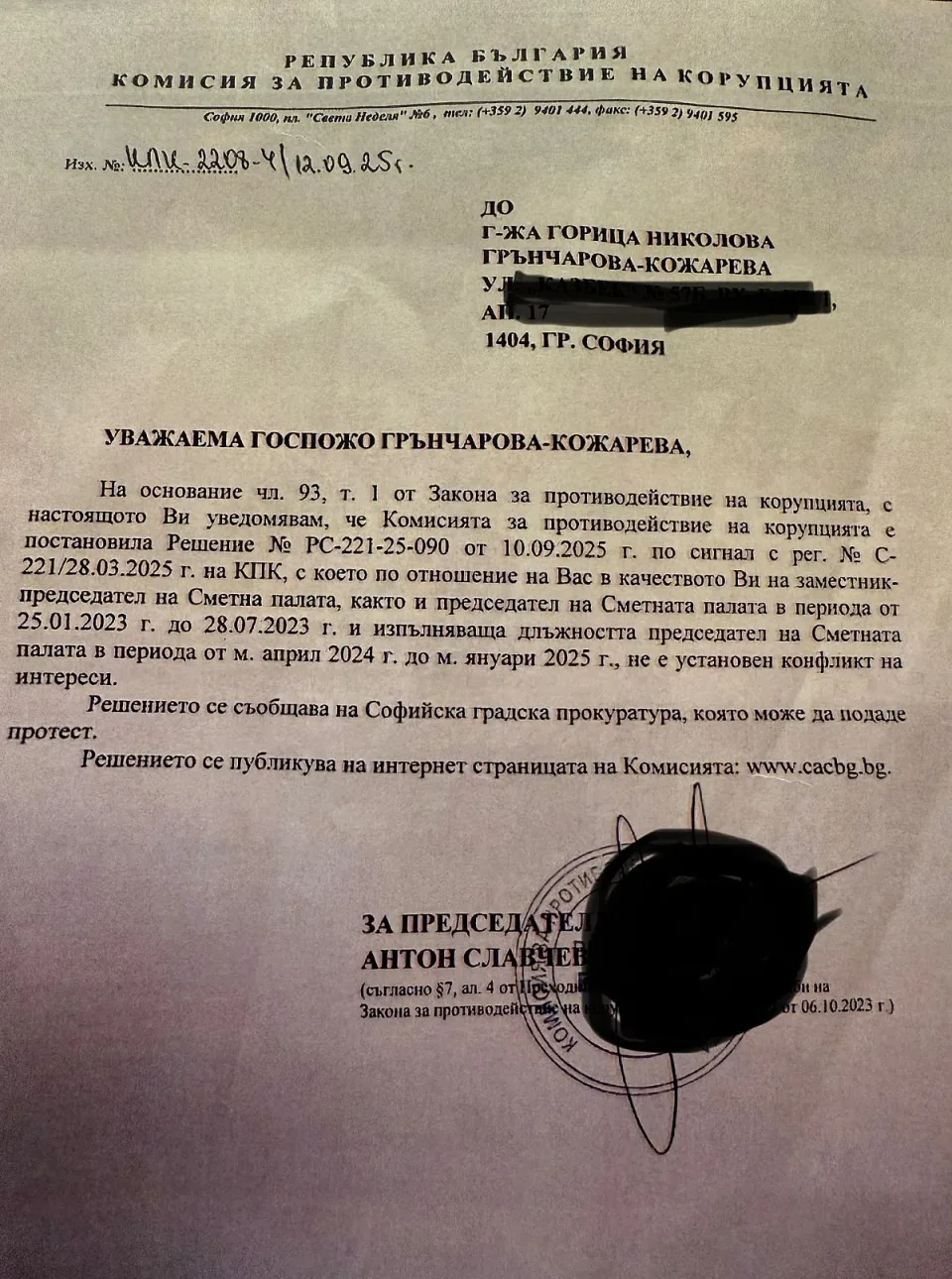 Междувременно, падна и другата опорка на депутата от ПП-ДБ, че Горица Грънчарова е дала сама на себе си възнаграждения. Комисията за противодействие на корупцията категорично се произнесе за липсата на конфликт на интереси. С други думи - всичко се е случило по закон и правила.