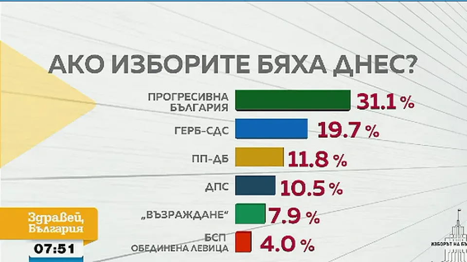 Разликата между "Прогресивна България" и ГЕРБ се топи. Партията на Румен Радев получава подкрепата на 31,1% от заявилите, че ще гласуват на предстоящите предсрочни парламентарни избори на 19 април. Втора са ГЕРБ с 19,7%.