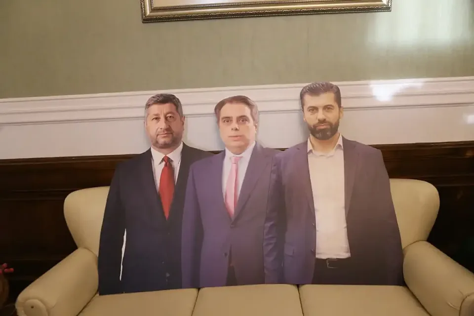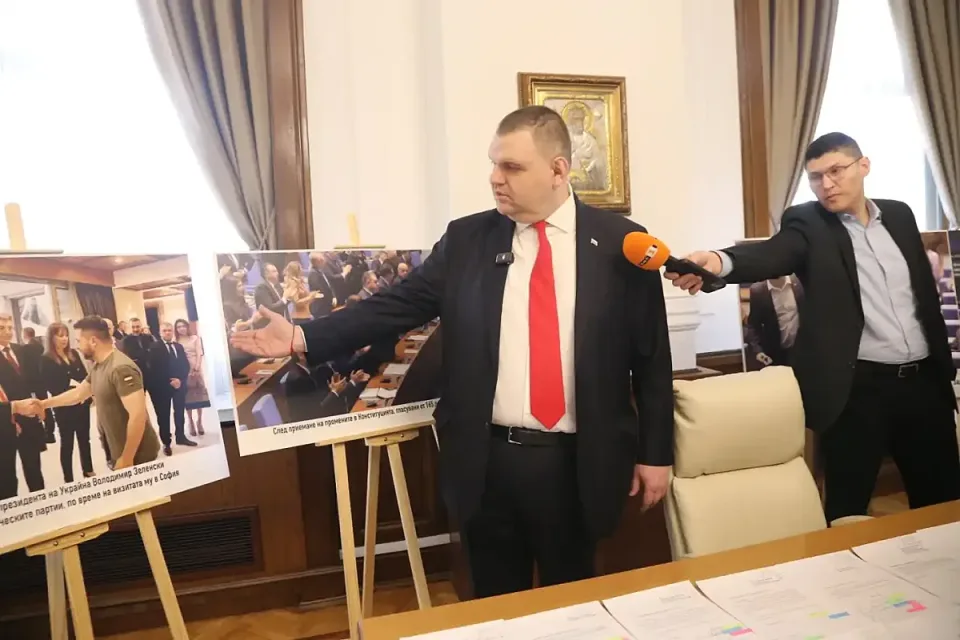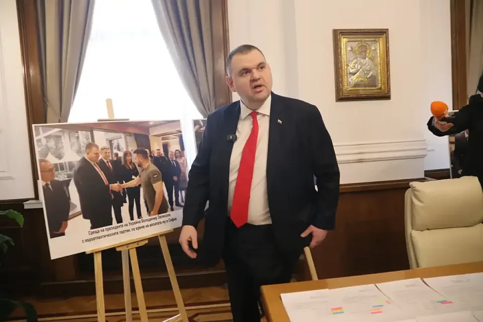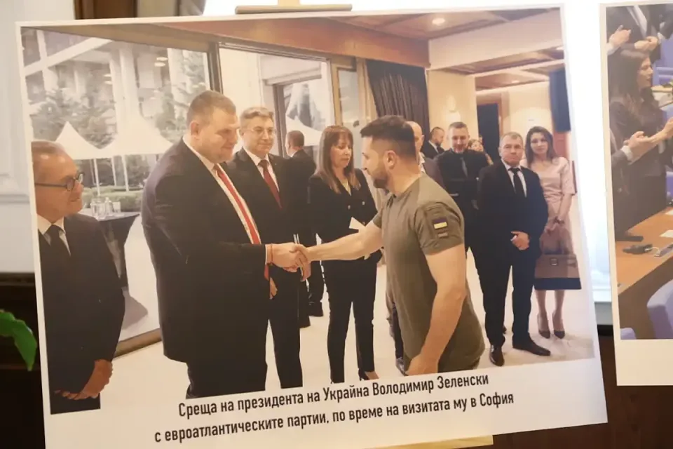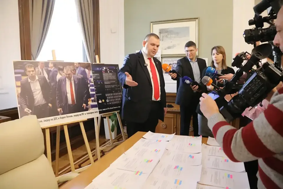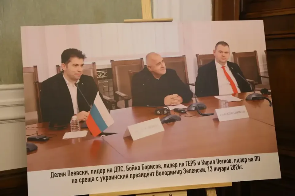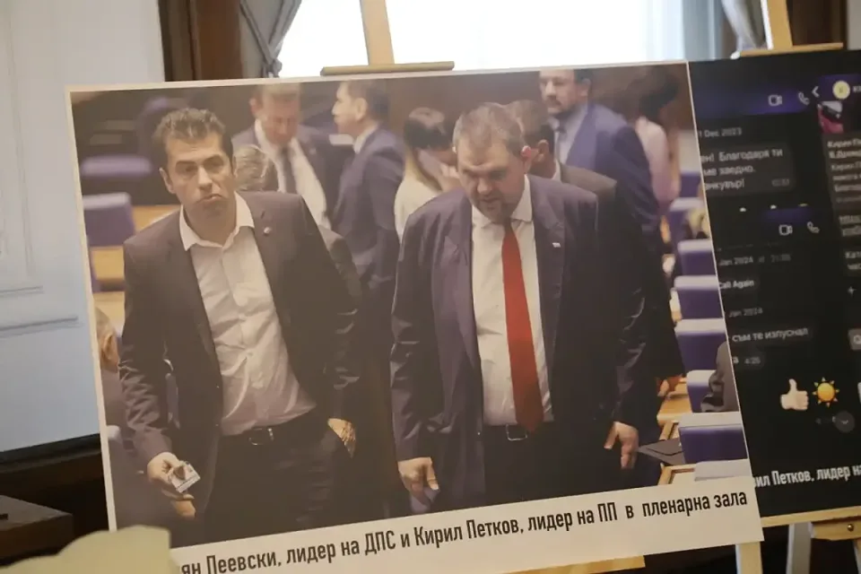 „Ето го мистичния, фамозен кабинет на Делян Пеевски. Нека го види цяла България“, каза Пеевски. На големи пана в кабинета бяха изложени ключови моменти от съвместното управление на ПП-ДБ с ГЕРБ и ДПС, на които се вижда как Кирил Петков, Асен Василев и Христо Иванов са до Пеевски и Борисов.