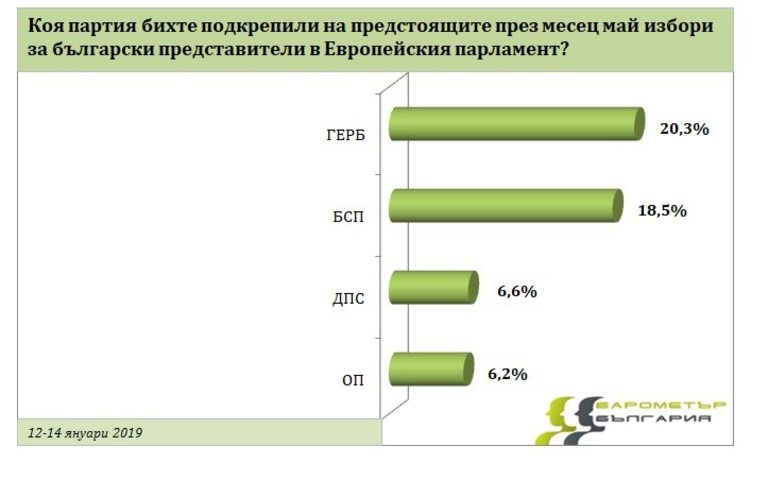 ГЕРБ, БСП, ДПС и ОП са четирите партии, които биха излъчили представители от България в Европарламента. Попитани коя партия биха подкрепили на предстоящите през май избори за български представители в Европейския парламент, 20,3 на сто посочват ГЕРБ; БСП - 18,5 процента; ДПС - 6,6 на сто; ОП - 6,2 процента.