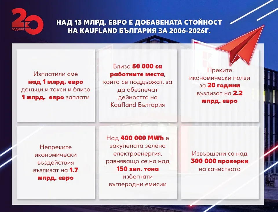 Търговската верига „Кауфланд България“ е създала пряка и непряка добавена стойност от 13,7 млрд. евро за българската икономика за периода 2006-2026 година. Данните са представени в специален икономически анализ по повод 20-годишнината на компанията в страната. Докладът проследява въздействието на веригата върху икономиката, заетостта и местното производство през последните две десетилетия.